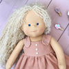 This Waldorf Doll is a great toy for your little one to play with. This handmade cloth doll comes fully dressed, however, each piece of clothing can be removed for your little one to play dress up. She is wearing underpants, a dress, a hand-knit sweater, and shoes. This Waldorf Steiner doll is made of all-natural wool and cotton. The Waldorf doll hair is very soft and can be brushed. Her hair is also up in two hair ties that come off, allowing our little one the ability to restyle her hair in any way they can imagine. This a great toy that our little one will love and take with them everywhere.