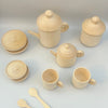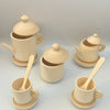 Handcrafted Wooden Tea Set play is perfect for your little ones pretend kitchen. The set comes with a large teapot with a lid, a small teapot with a lid, a sugar bowl with a lid, two cups, 3 large plates under both teapots and sugar bowl, two small plates under cups, and two spoons. Your little one will love pretending to serve or have a tea. This set is so much fun to play with and it's so perfect for pretend and imaginative role-play.