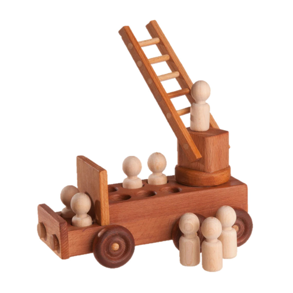 Beautifully handcrafted with attention to every detail, this fire truck is sure to exceed your expectations. The fire truck has a working ladder that moves and rotates. The wheels are fully functional making this toy so much fun to play with. Eight removable peg firefighters are included. This fire truck is fun for both boys and girls and it is so durable enough to be passed down through generations. This fire truck playset is perfect for open-ended play.